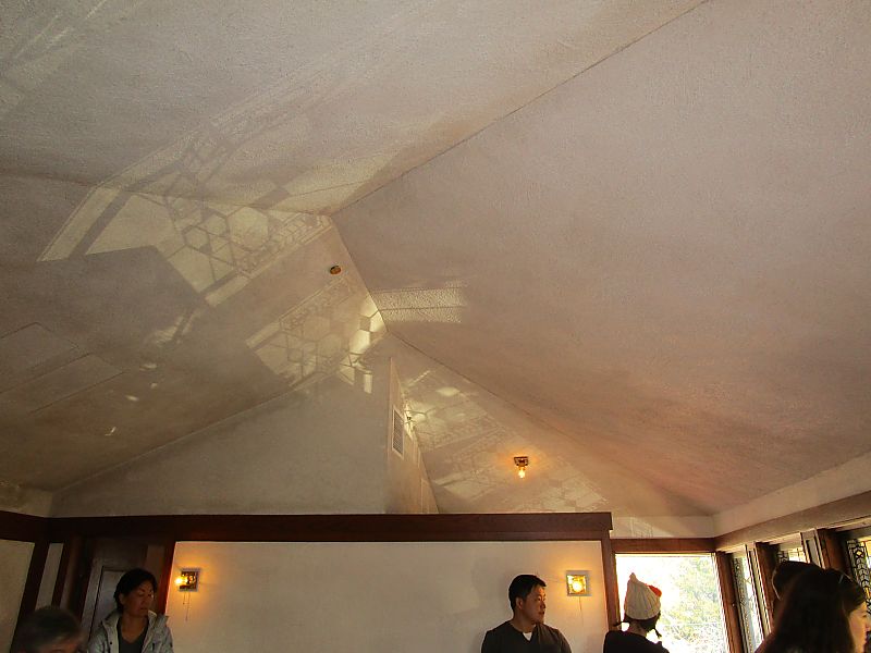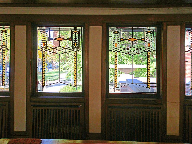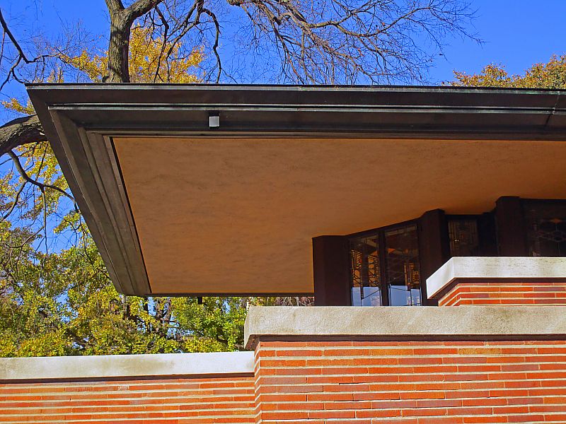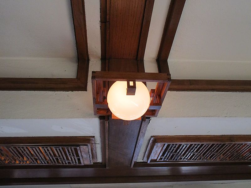 レンガによる組積造、木造が主体の構造ですが、他に軒の張出しやスパンの大きい部分にI形鋼、山形鋼を使っています。プレーリーハウスの他の住宅でも、部分的に鉄梁が使われており、ライトの水平線の強い造形は、鉄梁があって初めて成立したことがわかります。