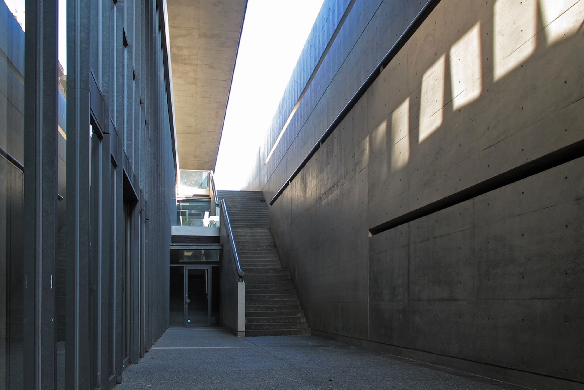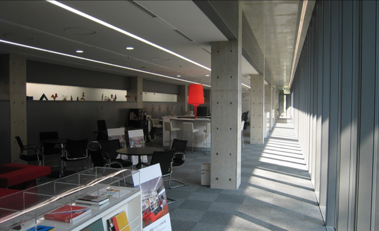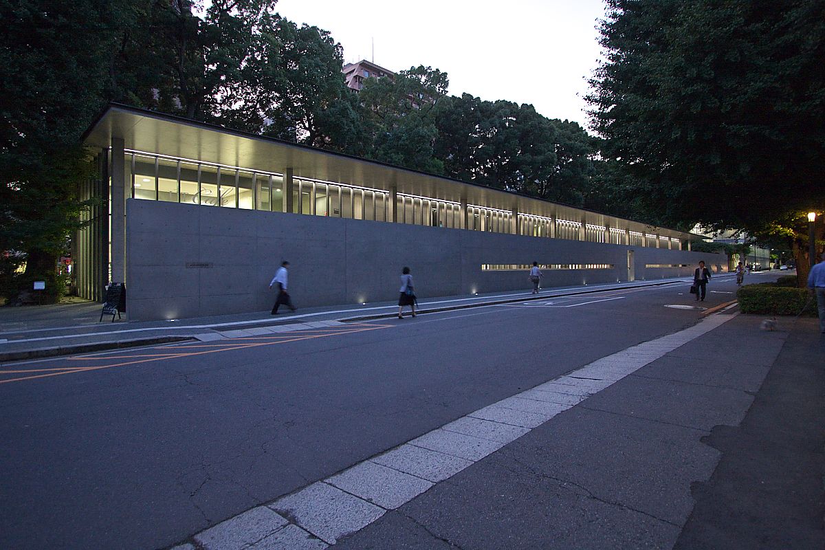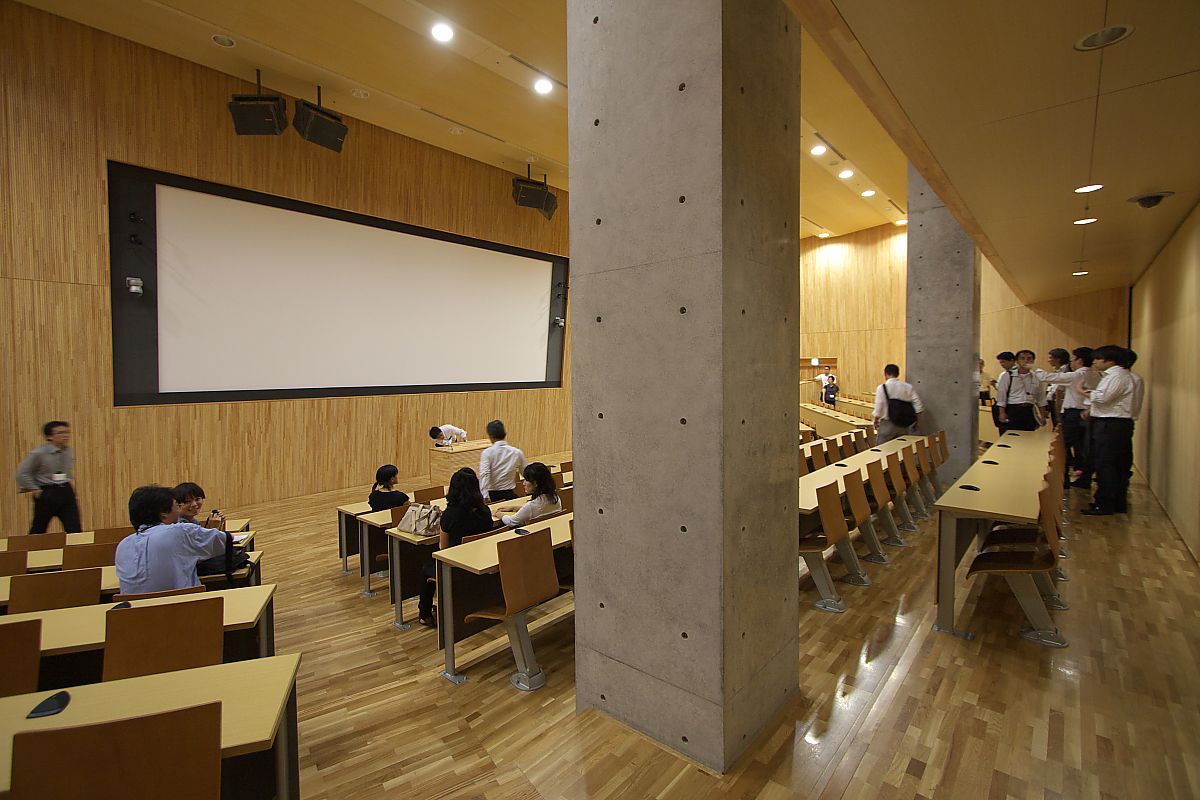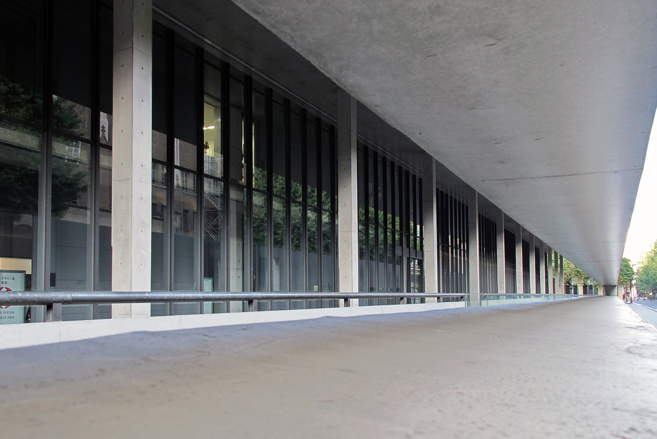 長さ約100mのコンクリート壁「考える壁」が特徴的で、仕切りではなく建物と既存の大学敷地をつなぐ“間”を表現している。イベントで投影などもされるこの壁と屋根庇が平行に走る外観はシャープで緊張感を与える。考える壁には20mのスリットが2ヶ所あるが、施工技術の高さに感心するほど綺麗な仕上がり。