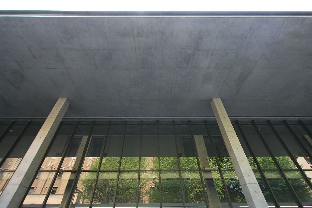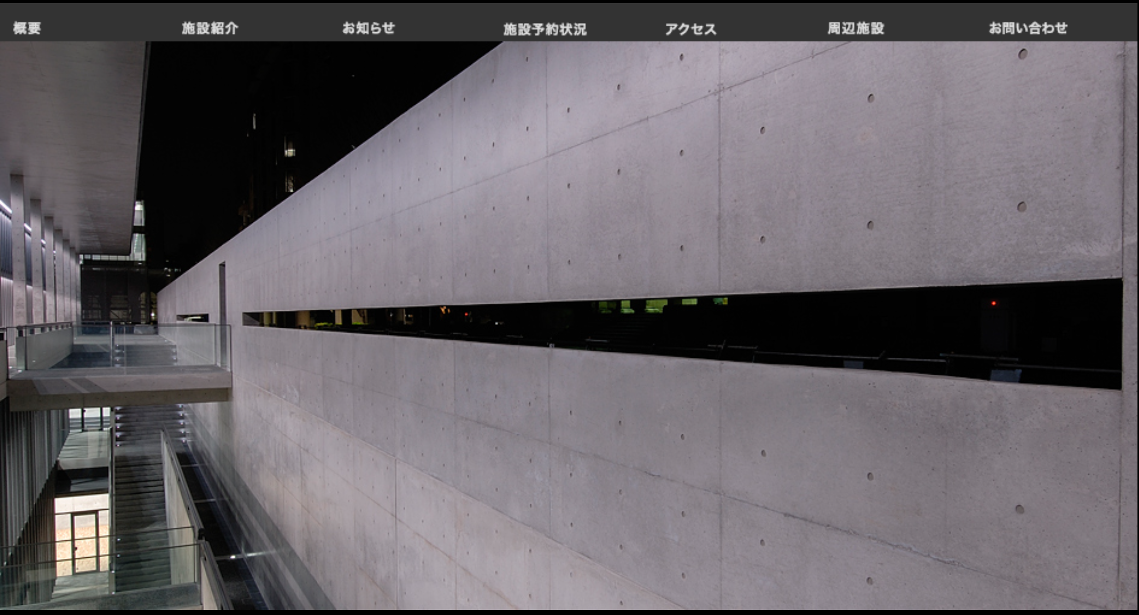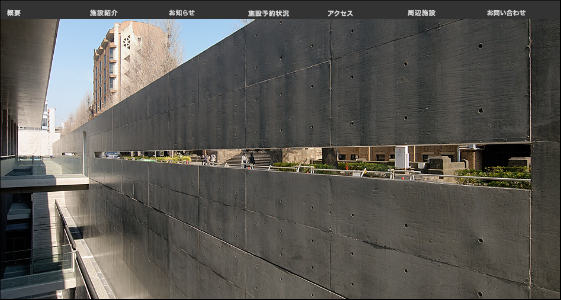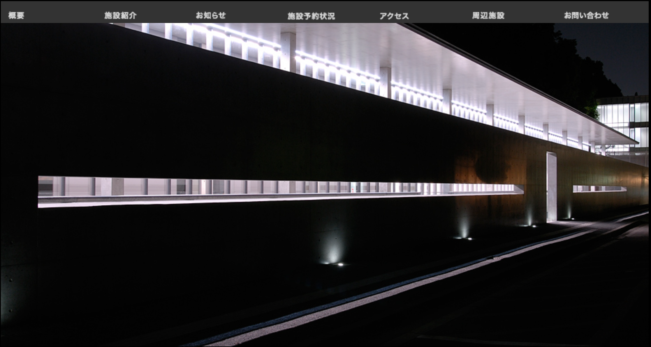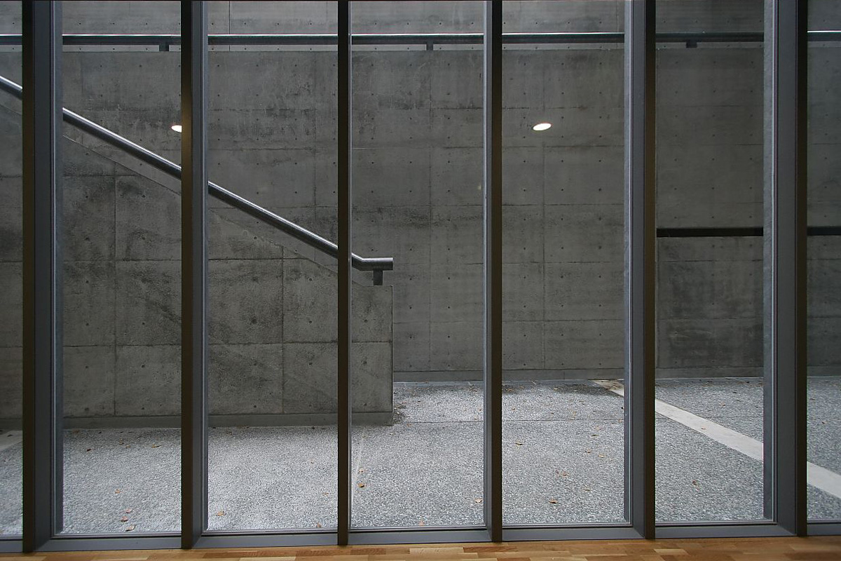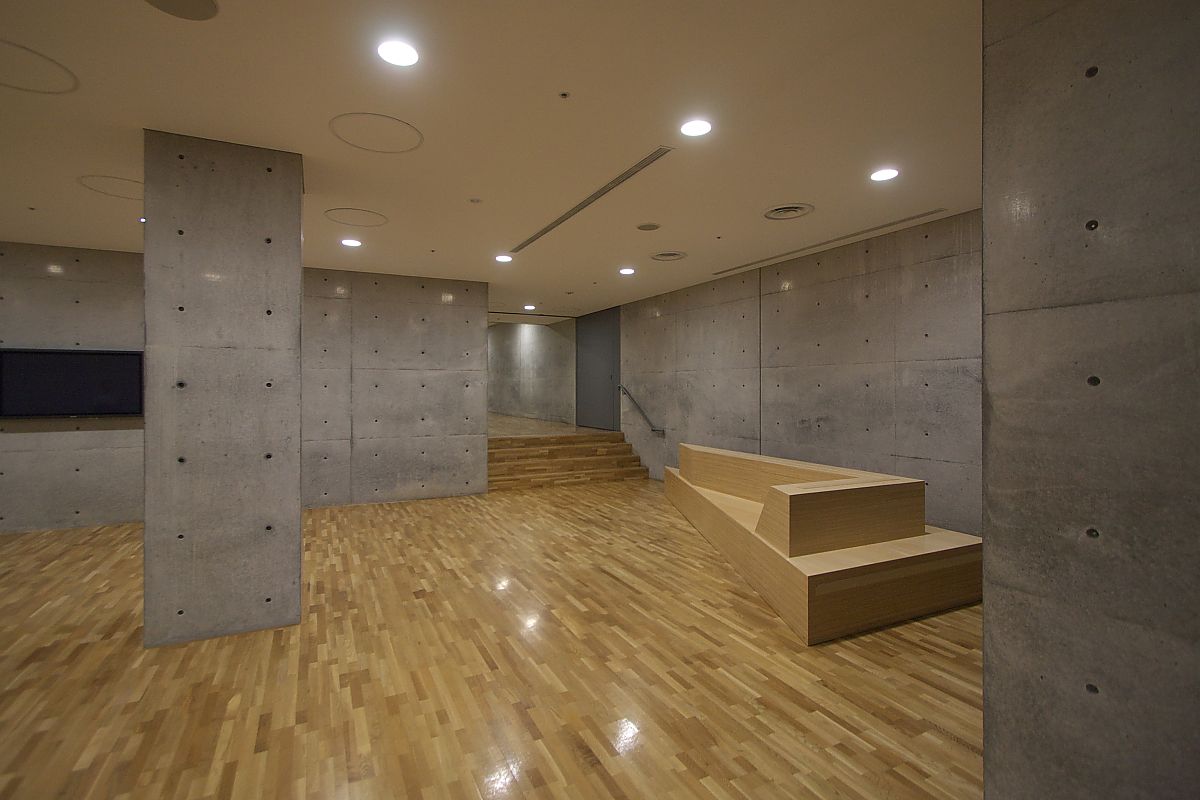 長さ約100mのコンクリート壁「考える壁」が特徴的で、仕切りではなく建物と既存の大学敷地をつなぐ“間”を表現している。イベントで投影などもされるこの壁と屋根庇が平行に走る外観はシャープで緊張感を与える。考える壁には20mのスリットが2ヶ所あるが、施工技術の高さに感心するほど綺麗な仕上がり。