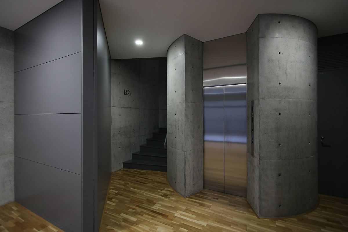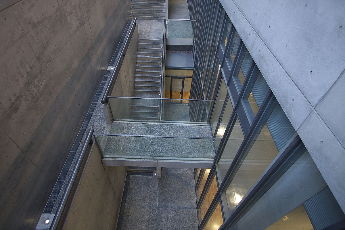 この地下2層分のドライエリアは階段状のオープンスペースで、地下2層、地上2層の研究・コラボレーション諸室とキャンパスの環境を繋ぐ積極的な意味を持たせている。さらに、このドライエリアの前面に100mの壁を設け、壁に穿たれた水平のスリットを通してキャンパスとこの建物との一体感を強め、このドライエリアを含む建物全体を覆う大屋根(大庇)とそれを支える細柱の並ぶ歩廊とが相まって、ボイドの空間性を高めることに成功している