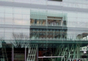 残念ながら海草のように「揺れる」柱にはならなかったのですが、6層の床を支えている柱にしては本当に細い。全ての柱がこんな細い鋼管で本当に持つんだろうか!と言う感慨がくる。(勿論持つのですが)おまけにこの柱はその内部を、階段であったり、エレベーターであったり、設備ダクトや配管スペースに使っていると言うのだからすごい。それはただただ建物を支えるためにのみあった柱は、消えてしまったと言うことだった。サービスシャフト兼用のメッシュ柱の登場=発明とあいなりました。海草のように揺れる柱を目指してやられた実施設計が、現実的な有用性を実現して行ったと言うことでした。この方式は以外にも一般化するかもしれない可能性を秘めていると感じました。